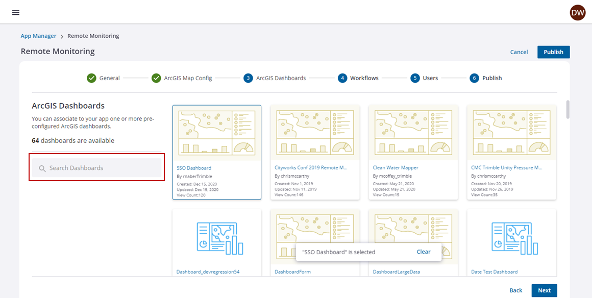 - If you have ArcGIS dashboards configured in ArcGIS Online or Portal for ArcGIS that you want to associate to the Remote Monitoring app, select the dashboard you want to use for the app or search for it in the Search Dashboards field.