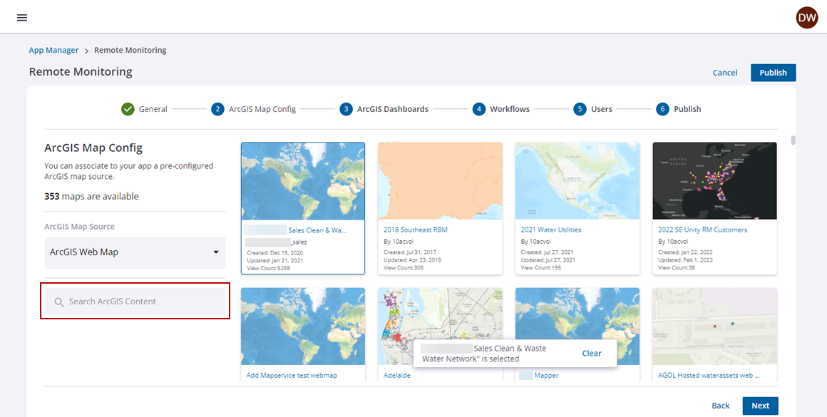 - On the ArcGIS Map Config section, select the web map you want to use for the app or search for it in the Search ArcGIS Content field. Please ensure that the web map has been shared in your ArcGIS organization or with ArcGIS Groups to ensure that all users who require access to the Remote Monitoring app also have access to this web map.