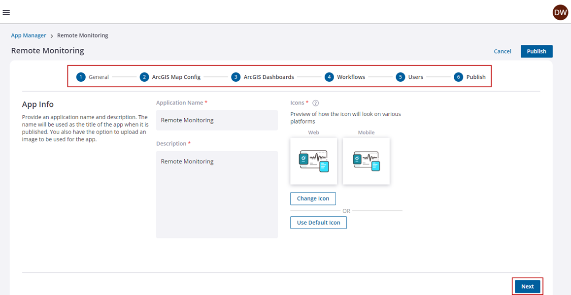 You can create and manage apps using the Remote Monitoring App Builder. These apps can be configured to include your existing business processes that can be targeted to specific users. The apps can contain specific forms and workflow templates that have previously been created. Users can be given permissions to these apps and can use them for data collection and managing work activities.