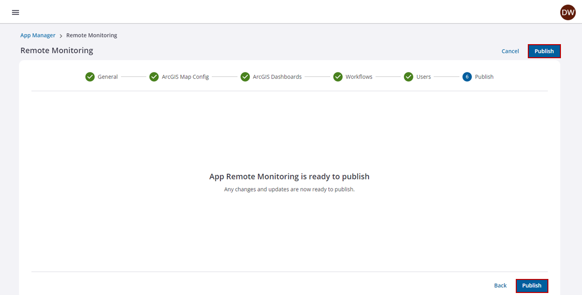 NOTE: If the ArcGIS web map associated to a published Remote Monitoring app is updated to include additional GIS layers, the app needs to be republished by editing the app and clicking Publish.