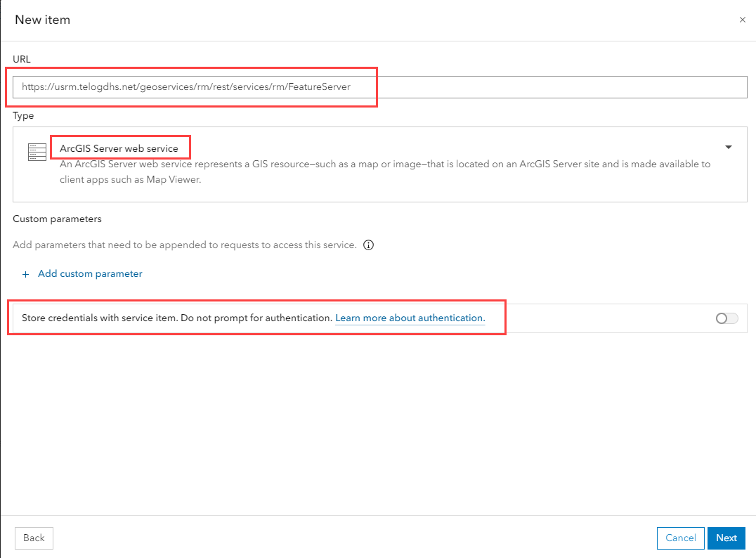 IMPORTANT: Be sure to enable Store credentials with service item. Do not prompt for authentication.