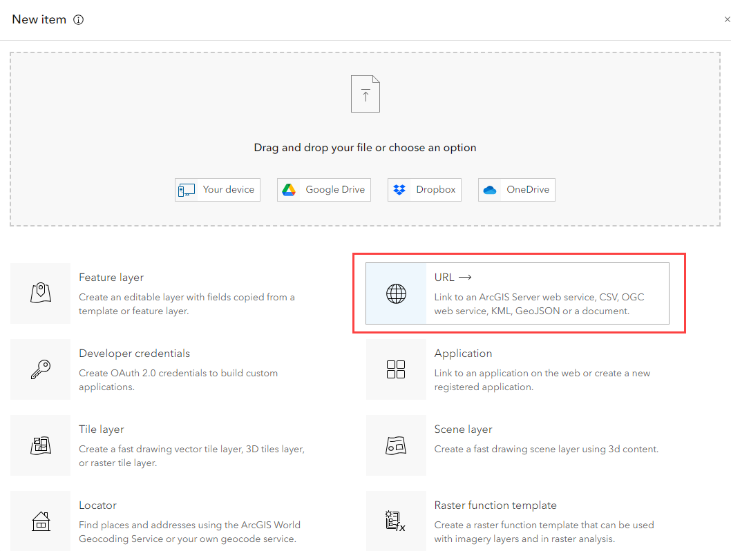 - Select a URL from the list of options. You can use the URL for the full service or the individual layers can be referenced directly: