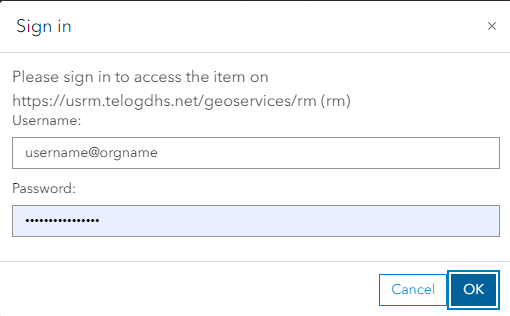 - Enter your credentials. The username should follow the format of <username>@<orgname> with the username being the Badger Meter Remote Monitoring administrator username that has been created for ArcGIS Connector. The password is the Remote Monitoring password for this user.