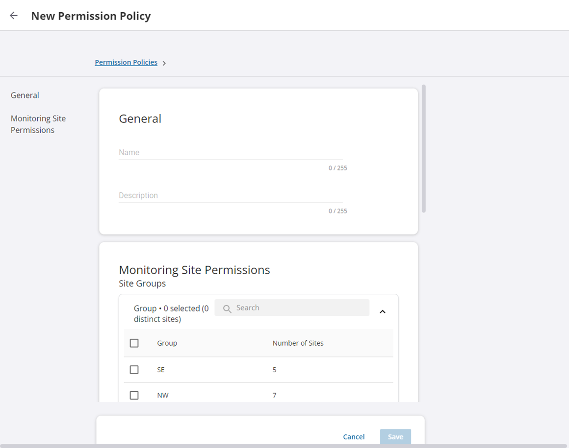 If you need to manage user access permissions to sites and measurements within sites, you need to create monitoring site access permission policies that you can then apply to users. These policies enforce user access based on defined site groups and measurement types.