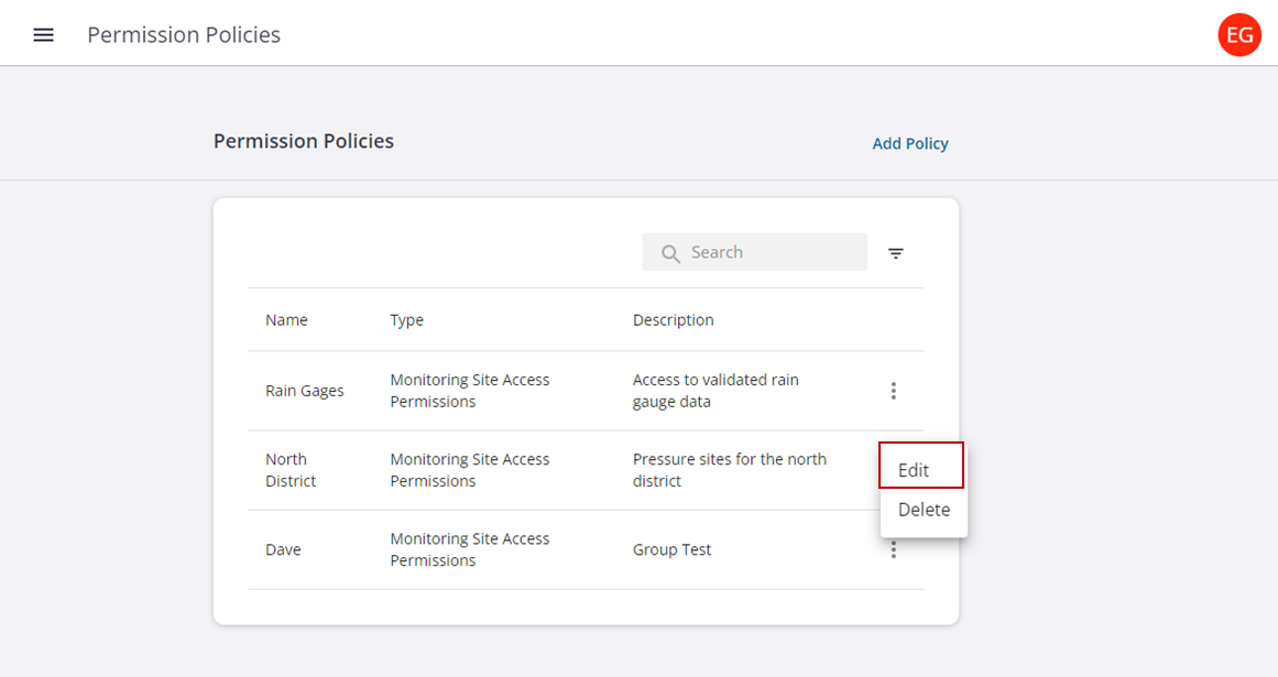 - From the list of permission policies, click the more icon and click Edit.