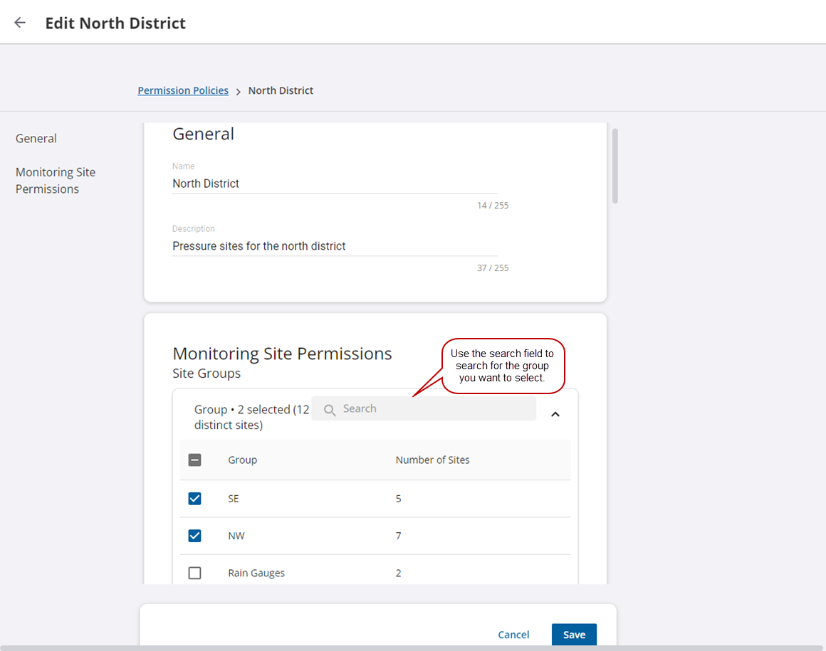 - In the Monitoring Site Permissions section, you can edit which site groups are given permissions.