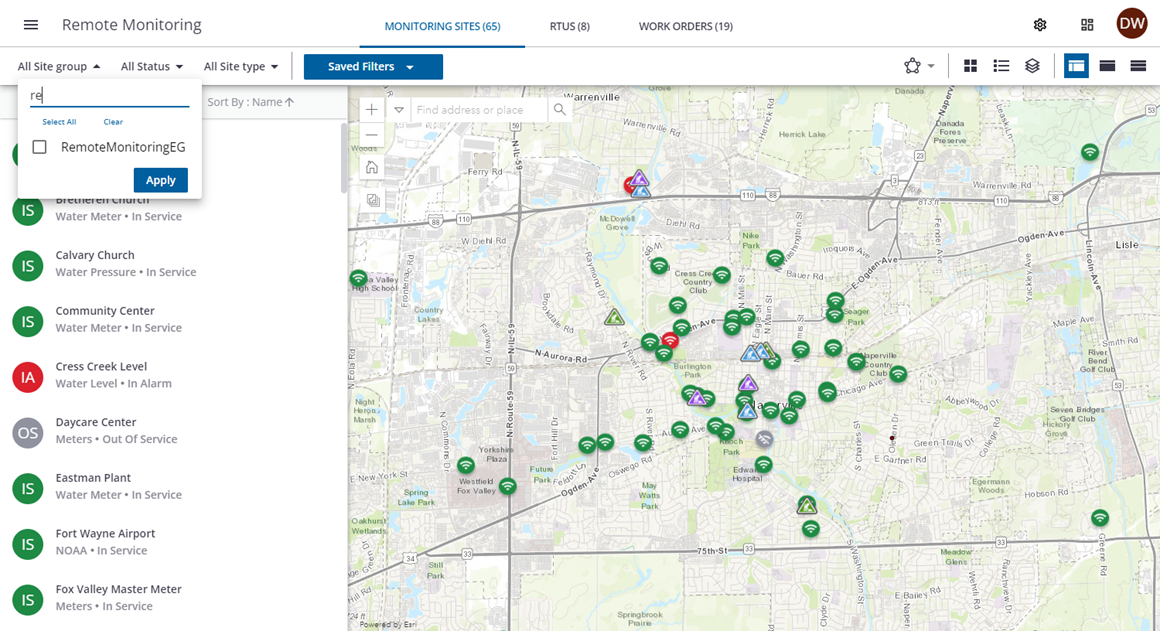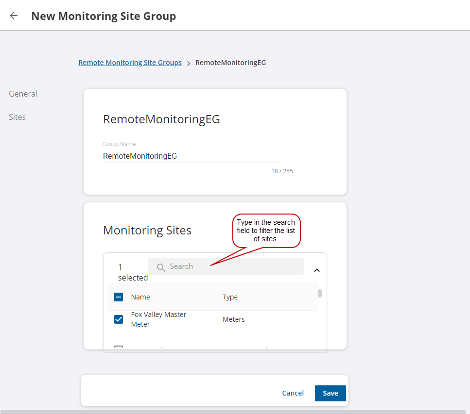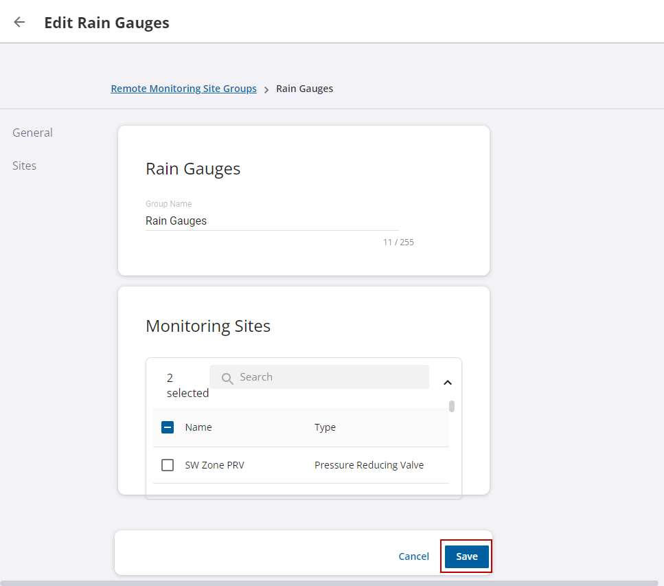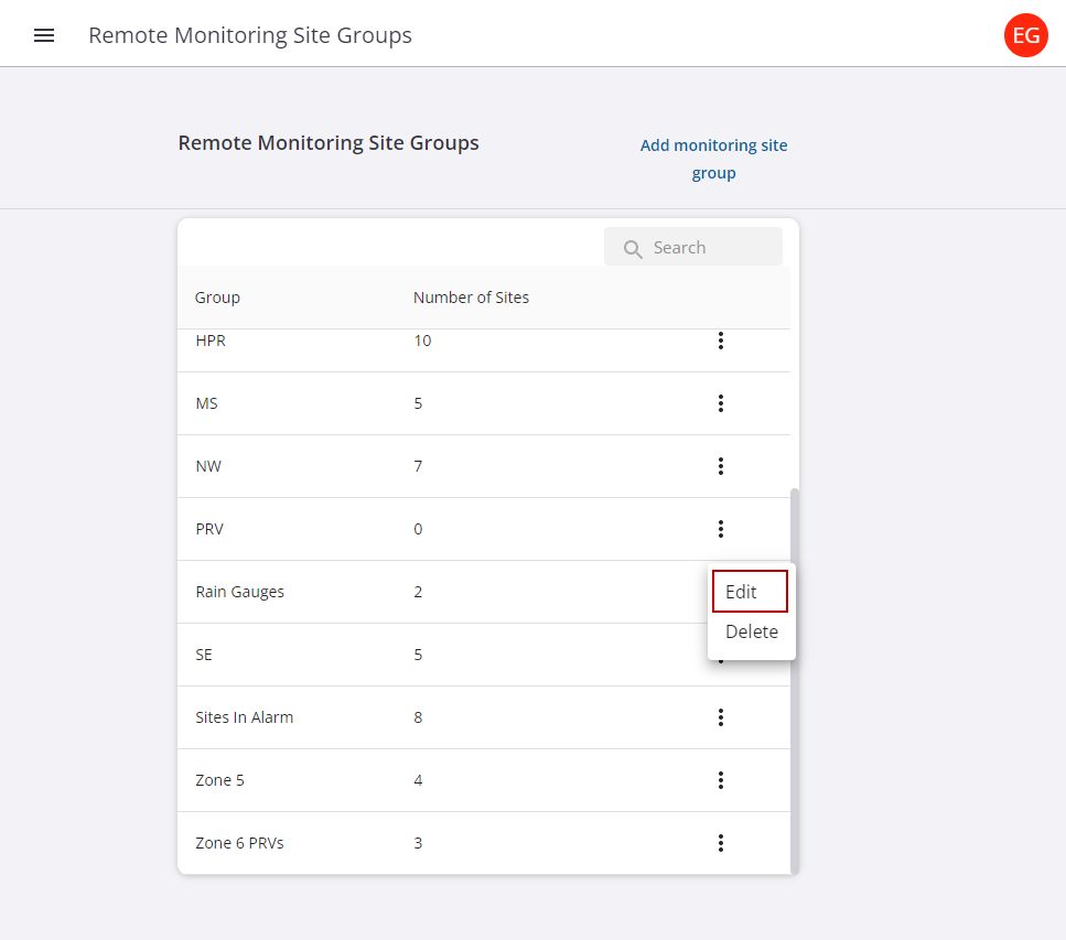 Group sites can be used to simplify site management, group filtering (for example, pressure zones or basins), or to manage user access permissions to sites within specific groups. This is done from the Remote Monitoring Site Groups page.