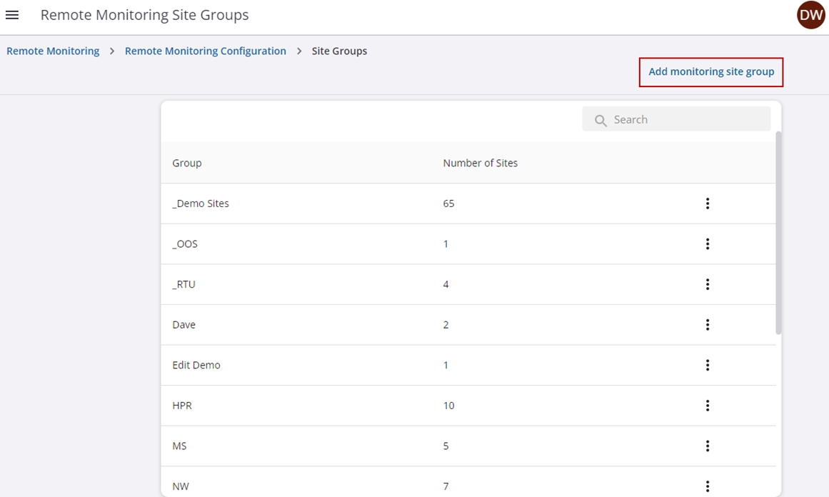 - Alternatively, click Add monitoring site group on the Remote Monitoring Site Groups page to create a new monitoring site group.