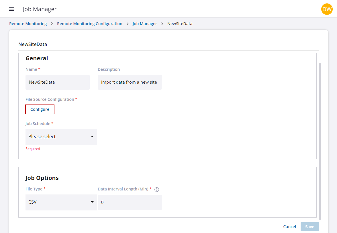 - Enter a unique Name for the import job, such as the site name from where you're importing data from.