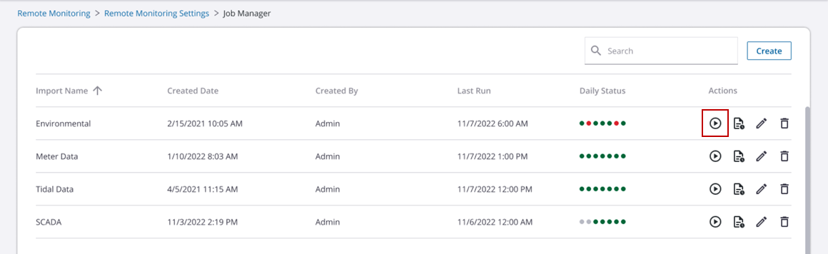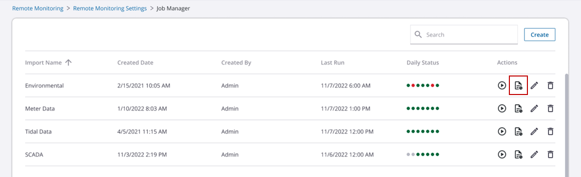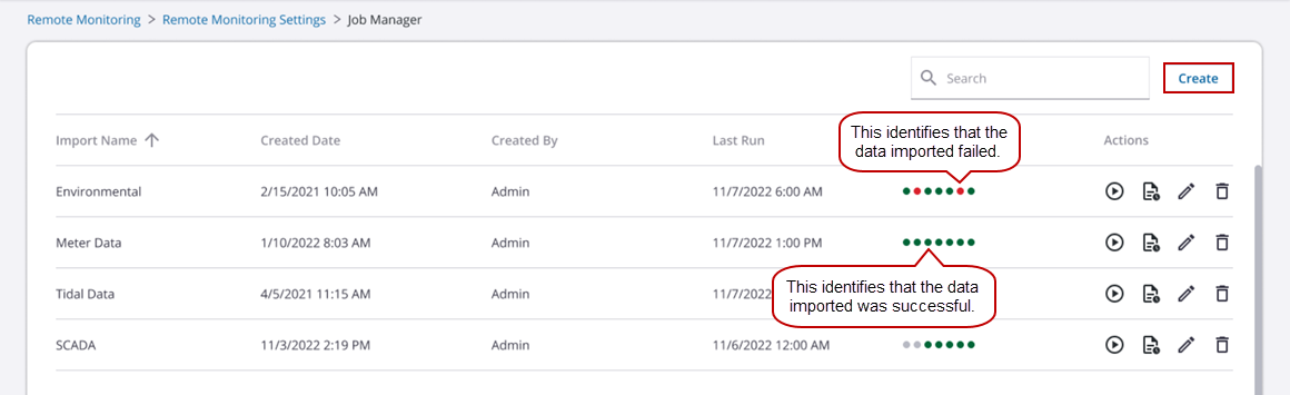 Each day the import is run, the Status column on the Job Manager page populates with a green or red circle. A green circle identifies when all files have successfully been imported. A red circle identifies when a file or files have failed to import during the process. When the import fails for any reason, the files are not removed from the FTP server. However the file(s) may continue to be logged as failed imports until they are removed by the user.