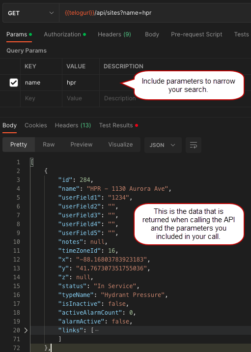 NOTE: If you have an on-premise installation and Telog Enterprise, you will need to use your local API instance as the URL instead of the public-shared Badger Meter Remote Monitoring site URL. In the following example, the Postman placeholder {{telogapi}} contains this URL.