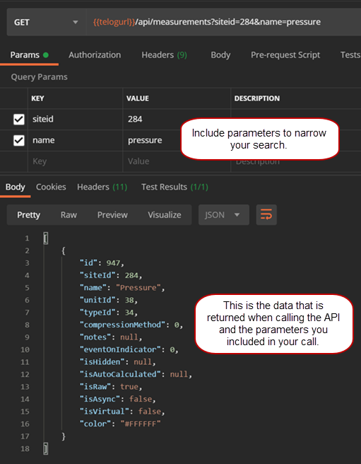 Here is an example of finding an existing measurement that belongs to the site with ID 284 and has the name pressure using Postman and JSON.