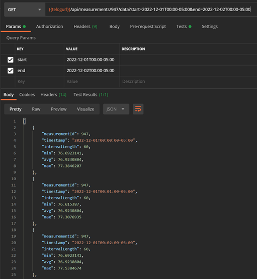 Here is an example of retrieving data from December 1, 2022 for measurement 947 using Postman and JSON. In this example, the start and end times are expressed in GMT-5 for the U.S. Eastern time zone.