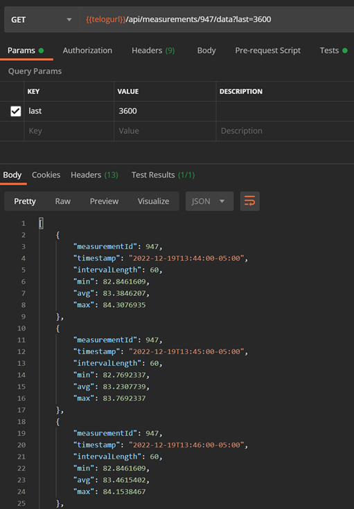Here is an example of retrieving the most recent or available, hours' worth of data for measurement 947 using Postman and JSON. In this example, we use the last parameter to request the most recent 3,600 seconds or one hour of data.