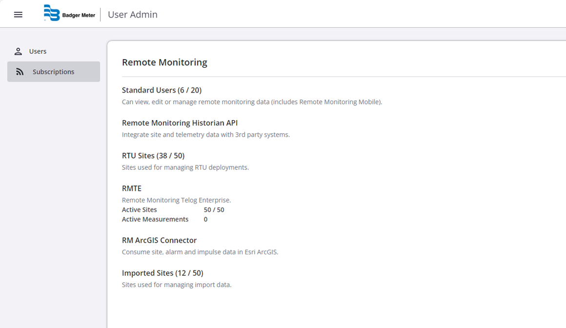 Any existing subscriptions appear on the page.Next to each subscription is a set of numbers. The first number indicates how many entitlements are currently being used. The second number is the maximum number of entitlements you have. If the account is using more than the maximum entitlements allowed, a warning is displayed. This must be corrected during the next entitlement renewal cycle. Additional users or sites cannot be added and/or deployed until the number of entitlements used do not exceed the maximum number of entitlements.