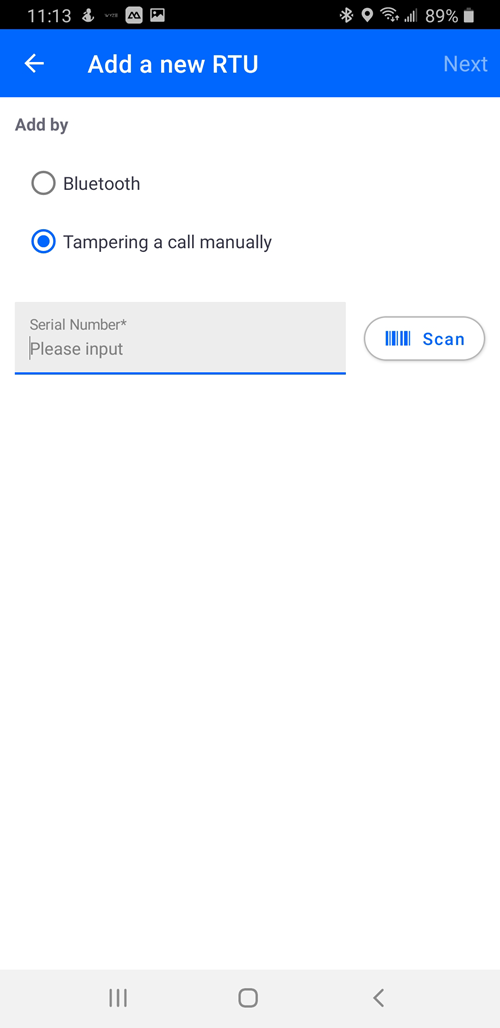 - Enter the Serial Number of the RTU in the field, or Scan the barcode on the RTU.