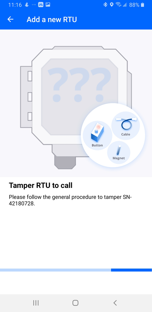 - Tap the RTU you want to tamper from the RTU list, or tap in the search field to search the RTU serial number, scan the RTU barcode, or scan for the RTU using Bluetooth.