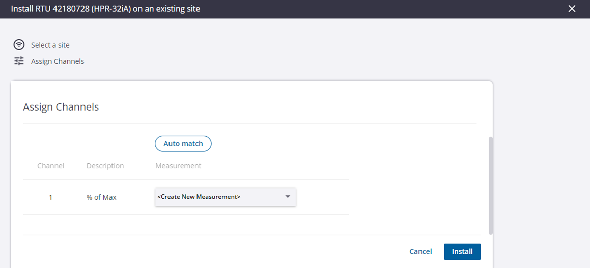 - Click Auto Match to automatically choose the channels assigned to the RTU type, or manually select them from the Create New Measurement drop-down list.