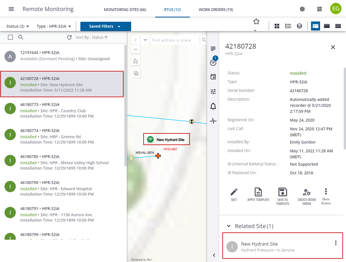 - Click the new site under Related Site on the RTU details panel to open the site details.
