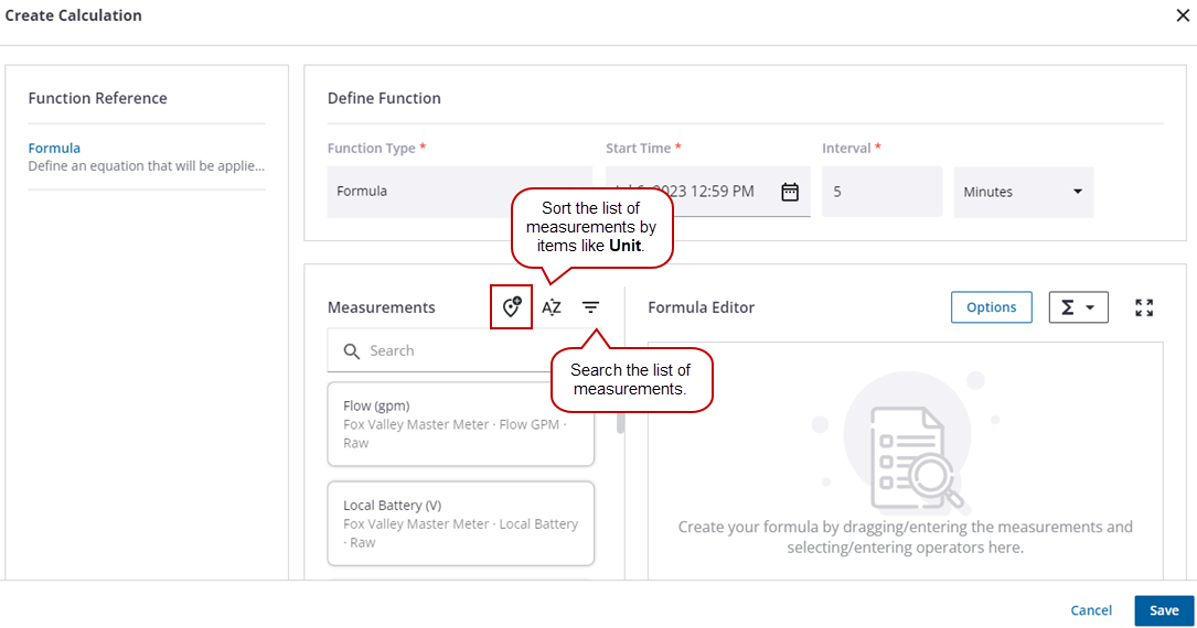 Now that you've defined your functions, you need to create the calculated measurement formula. The Measurements section displays all the measurements available for the selected site. You can search and sort the list for specific measurements, as well as add additional sites to the list.