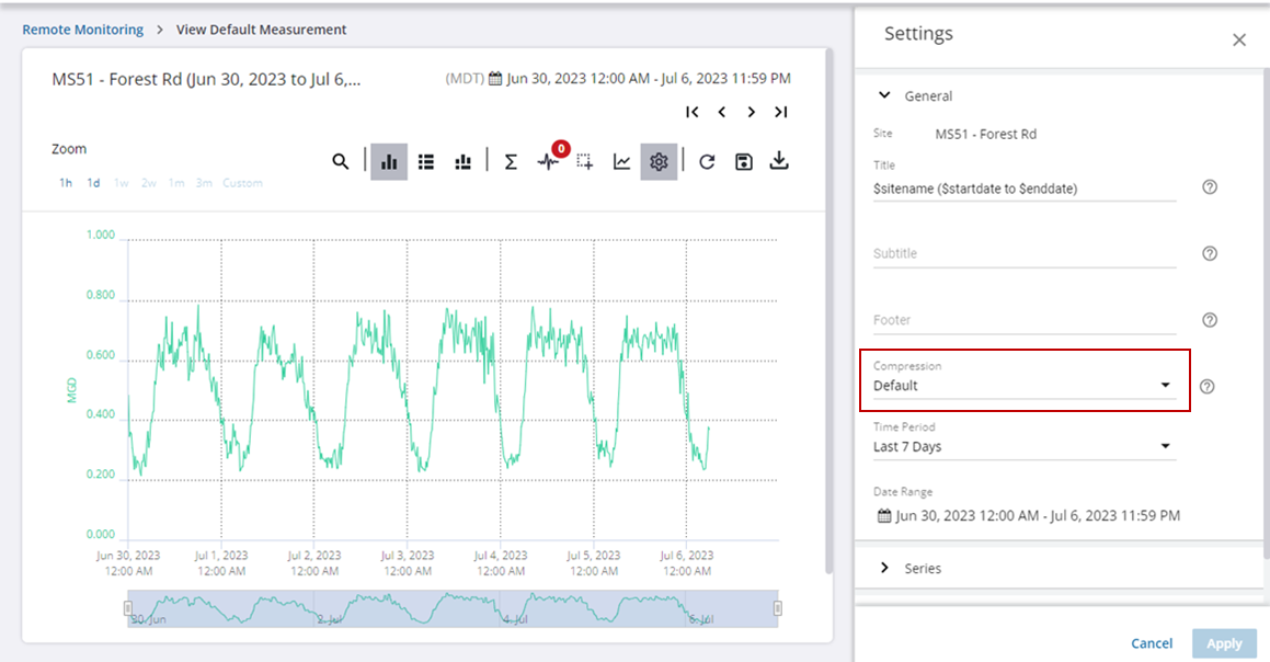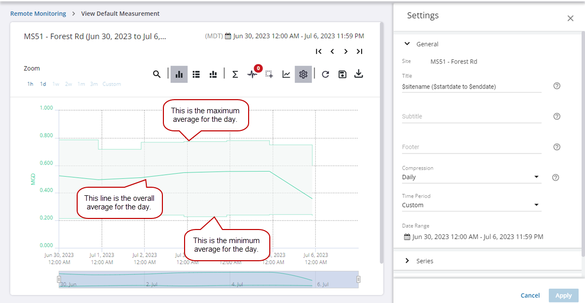However, when the compression is set to Daily, for example, Remote Monitoring will take all 15-minute data points, display the average maximum and minimum values for each day, and display a line showing the overall average for each day (between the minimum and maximum values) based on the daily compression interval.