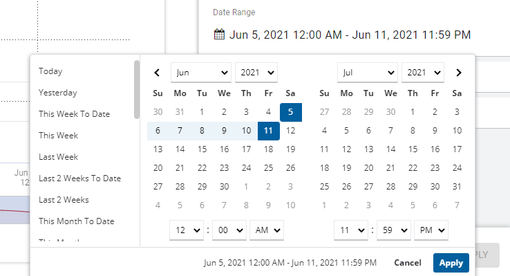 - Click in the Date Range field to update the start and end dates and times to a custom period.