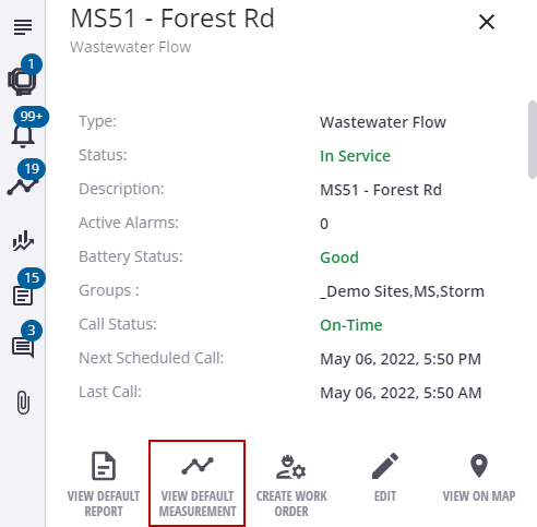 Another way to graph time series data is from the default measurement report on the site details panel. The default measurement is determined by the type of monitoring site.