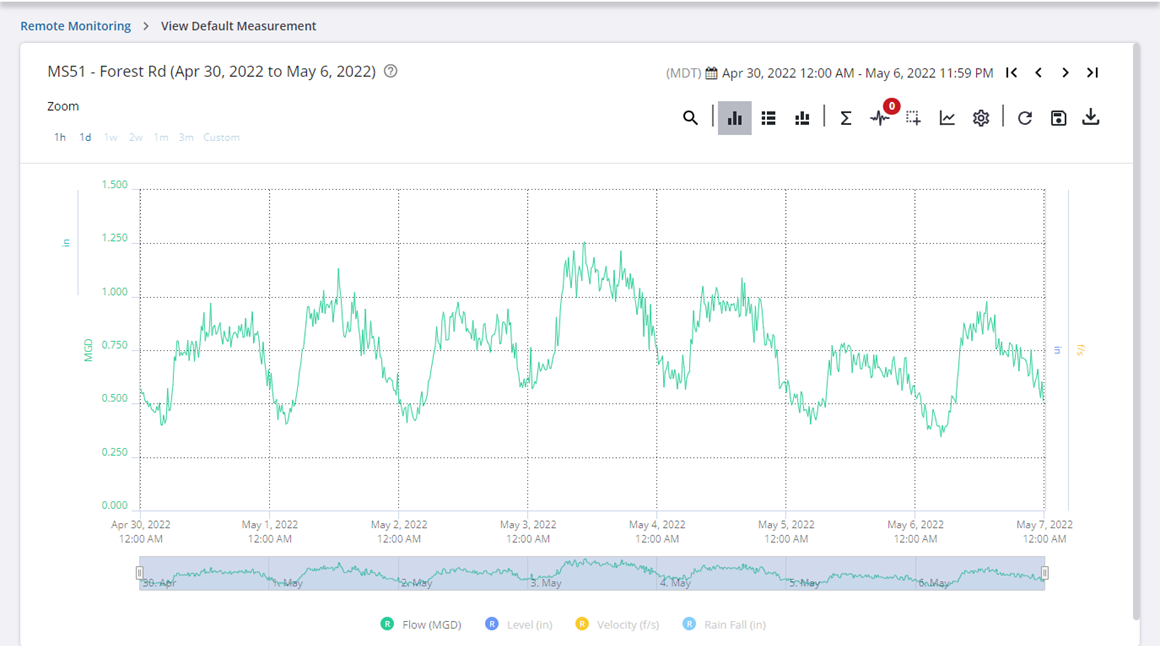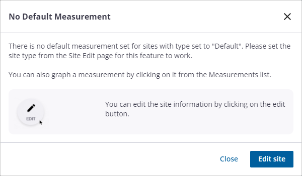 The telemetry report populates with the default measurement. Please note if you get the following message indicating that there is no default measurement set for the site, either change the site type by editing the site details, or graph the measurements by selecting them from the Measurements section.