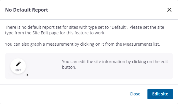 The default report data for the site populates. Please note if you get the following message indicating that there is no default report set for the site, either change the site type by editing the site details, or graph the measurements by selecting them from the Measurements section.