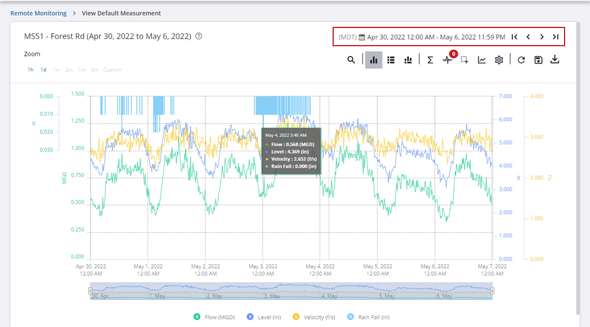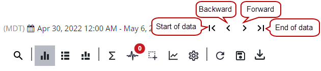 - You can also update the date range by clicking the Backward or Forward arrows in the upper-right corner to view the previous or next time period of data. Click the start of data arrow to go back in time to the first instance of collected data or the end of data arrow to go to the most recent instance of collected data.