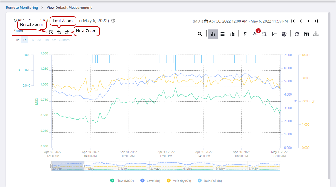 - Click Reset Zoom to reset the graph measurements, Last Zoom to return to the previous measurement zoom, or Next Zoom to return to the new measurement zoom.