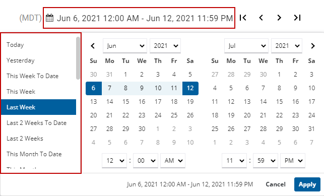 - Update the date range manually by clicking the dates and entering the date and time values. The first date selected corresponds to the report start time and the second date selected corresponds to the report end time.