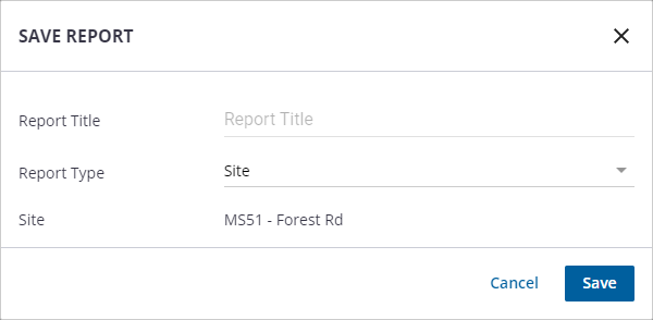 - Select Site from the Report Type drop-down list to save a report for the specific site. When you save the report as a Site report it saves under one site. On the Save Report panel, the Site field shows the first site you selected for the report in the list. If you select all the sites in the list, the Site field is populated with the first site listed at the top of the list.
