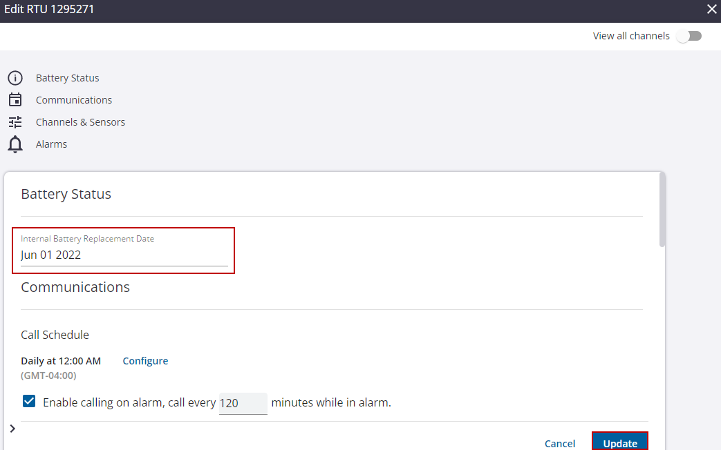 - Manually update the battery replacement date from the mobile app. See Update an RTU Battery Replacement Date for more information.