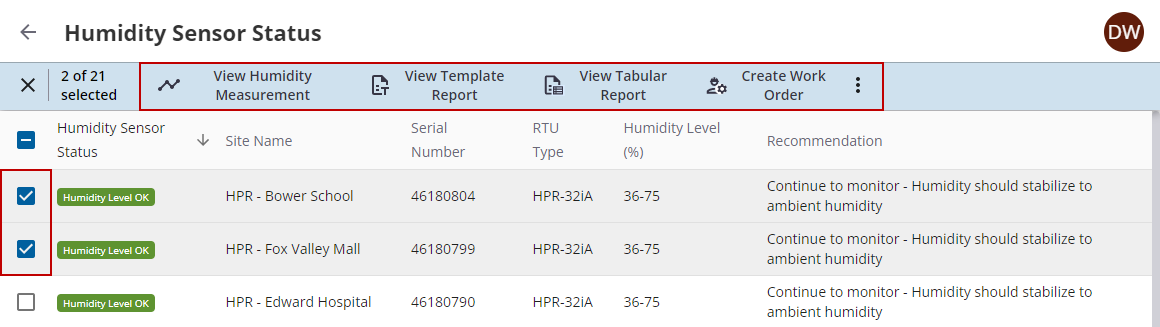 - Alternatively, click Humidity Sensor Status to open the full list of RTUs and their humidity status.