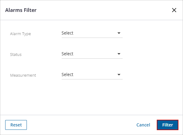- In the panel that opens, select the desired filters for Alarm Type, Status, and Measurement.