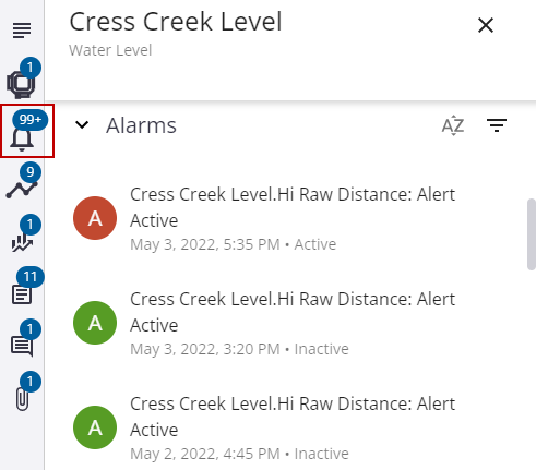 - Click the Alarms icon or scroll down to the Alarms section to view the most recent alarms for this site. The number of alarms is indicated on the Alarms icon badge.