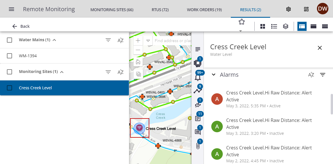 - Click a site with an active alarm on the map to open the site details.