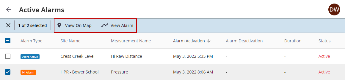 Any applied filters are shown at the top of the Alarms section.