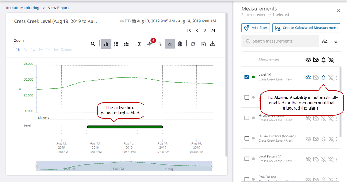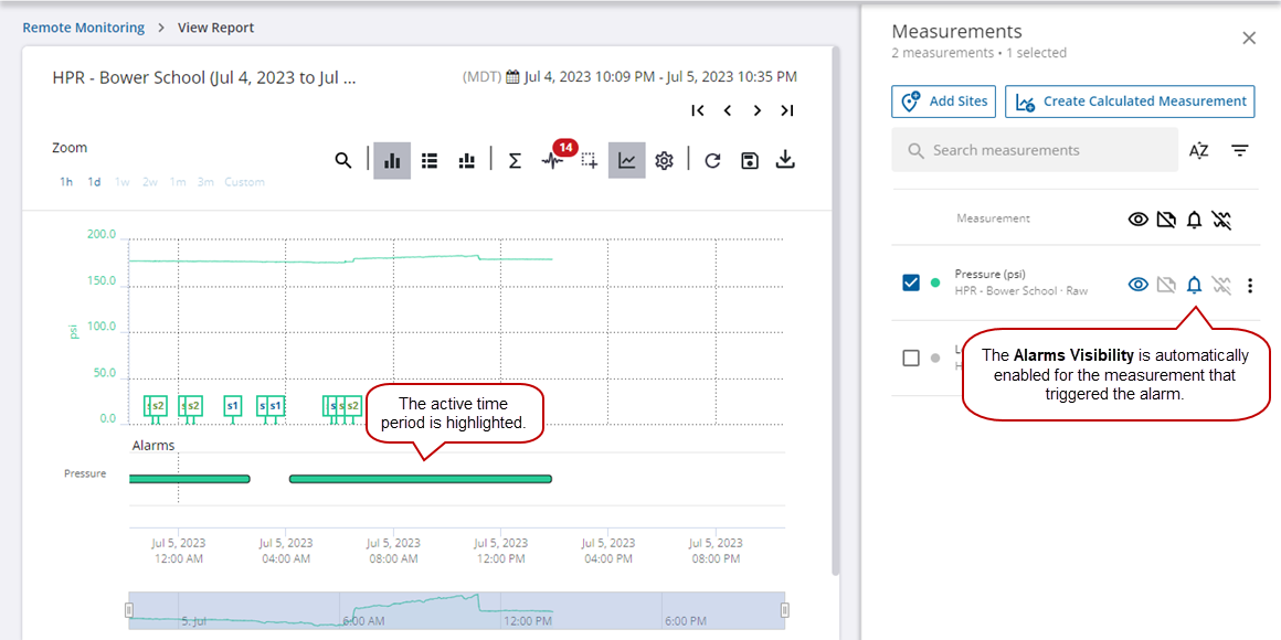 The time period that the alarm was active is highlighted on the graph, and the Alarm Visibility is automatically enabled for the measurement that triggered the alarm.