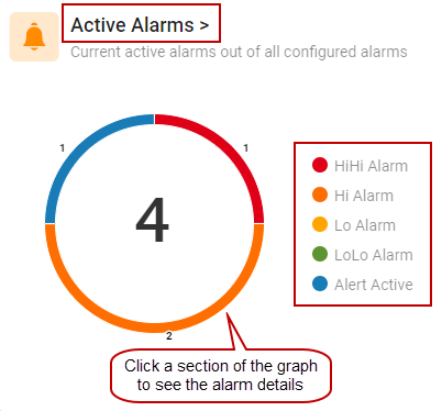 - In the Active Alarms widget, click the widget name, legend, or any part of the circle graph to open the active alarm details.